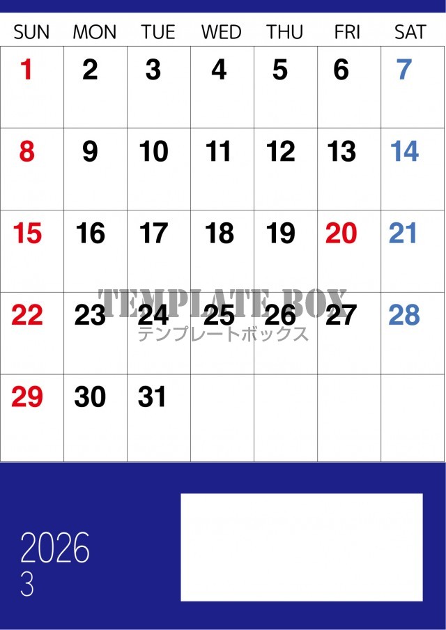 無料テンプレート:2026年3月カレンダー:縦型青のシックなカレンダー
