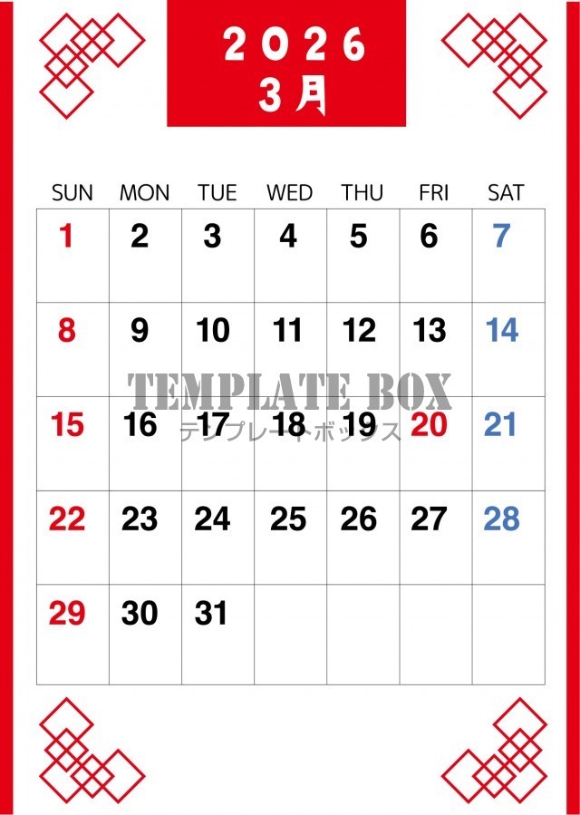 2026年3月カレンダー:縦型赤枠のカレンダー