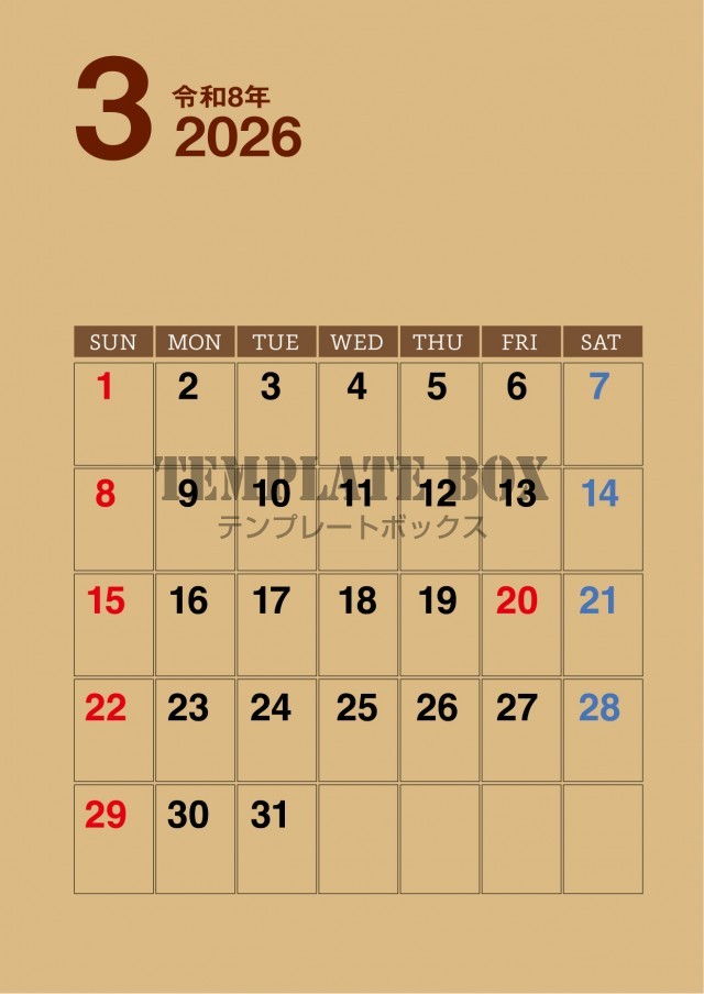 2026年3月カレンダー:縦型赤枠のカレンダー