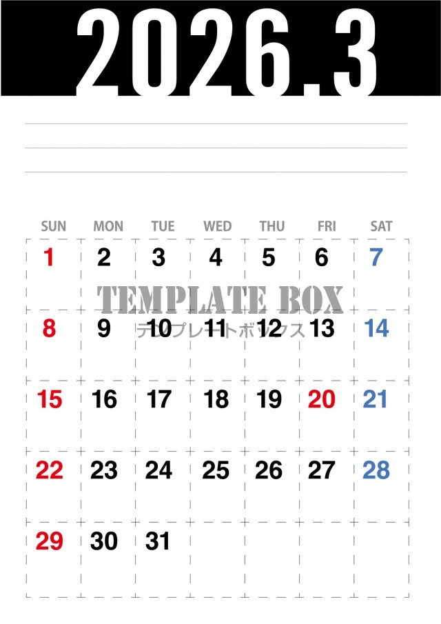 無料テンプレート:2026年3月カレンダー:縦型モノクロ、メモ欄付き
