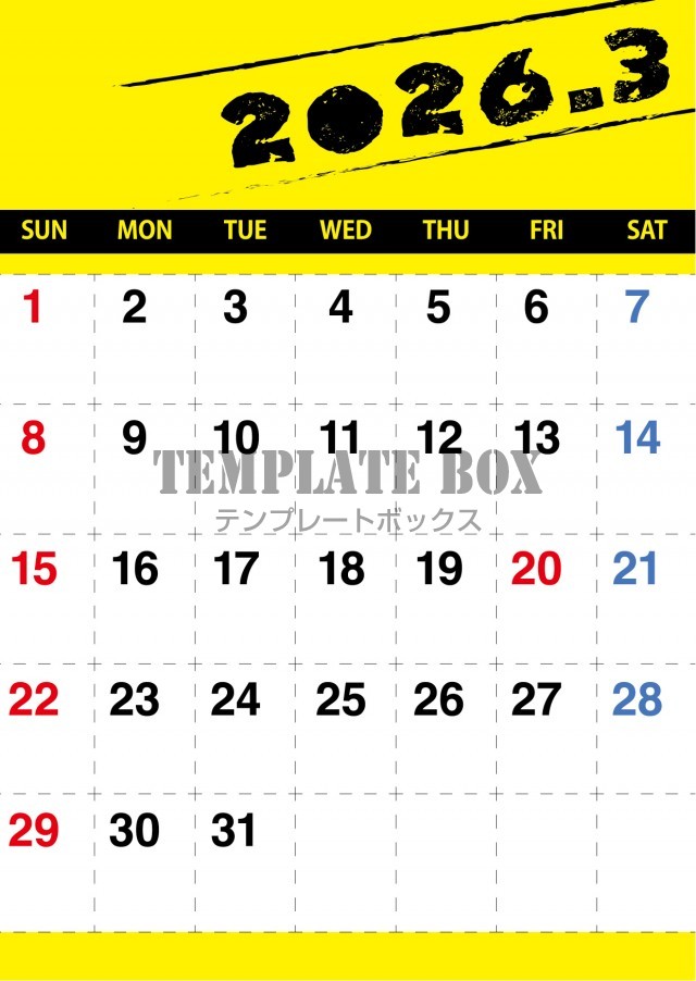 2026年3月カレンダーです。みやすくて便利なカレンダーなのでスケジュー…