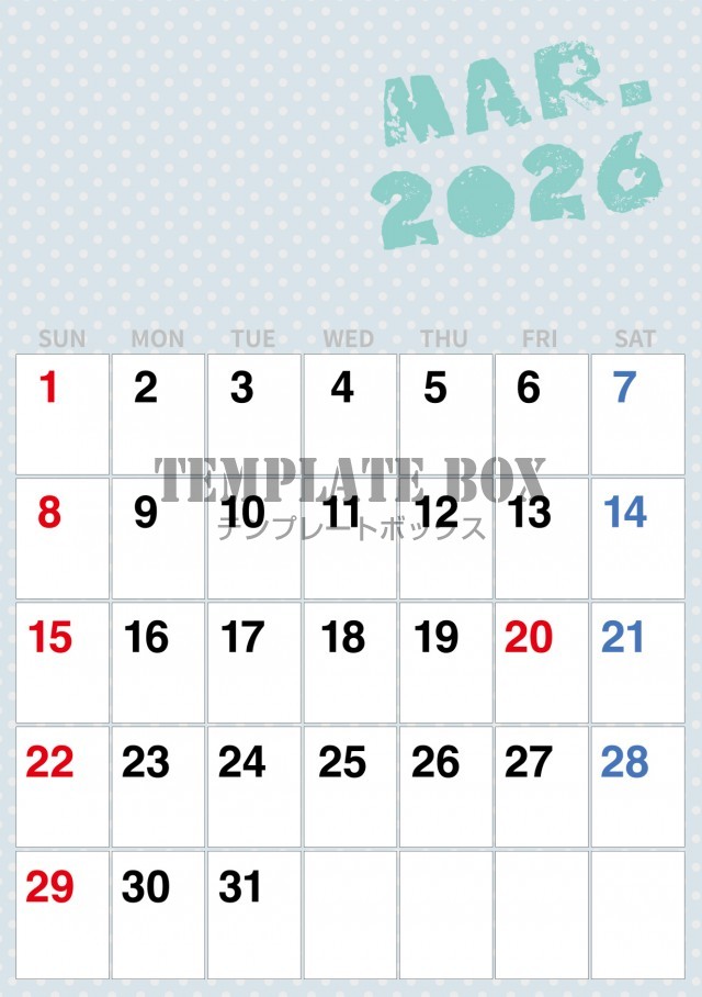 2026年3月カレンダー:横型水玉がかわいいカレンダー