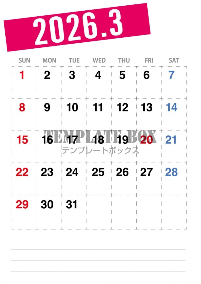 ピンクの背景がオシャレデザインです。2026年3月カレンダーです・無料で…