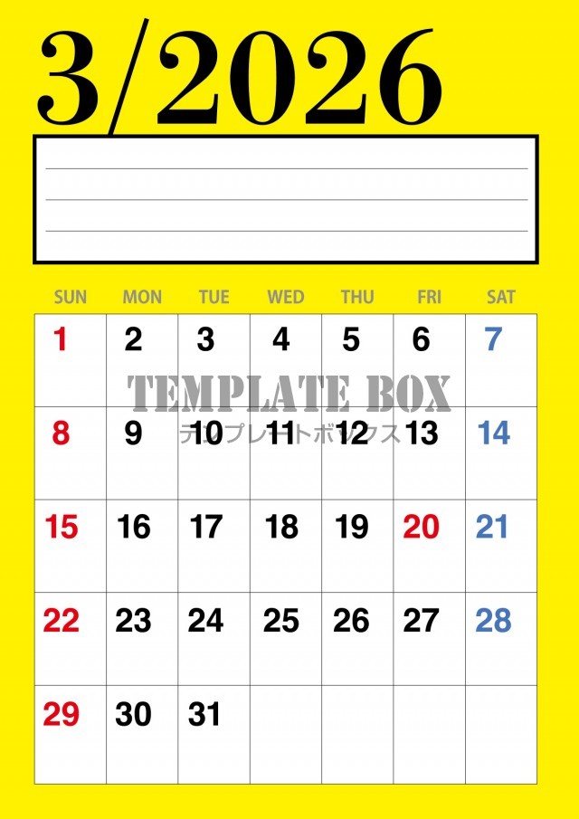 無料テンプレート:2026年3月カレンダー:縦型黄色のカレンダー