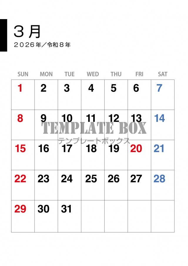 2026年3月カレンダー:ビジネス用カレンダー