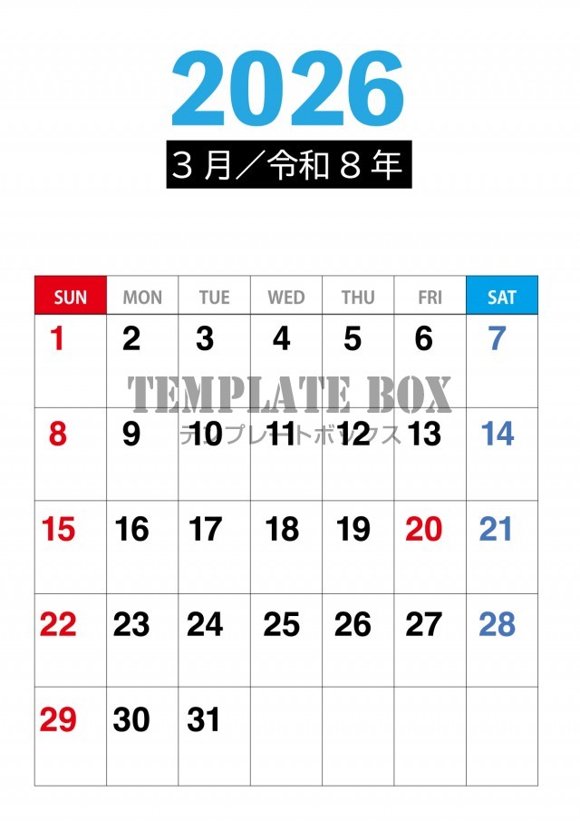 2026年3月カレンダー:縦型シンプル便利カレンダー