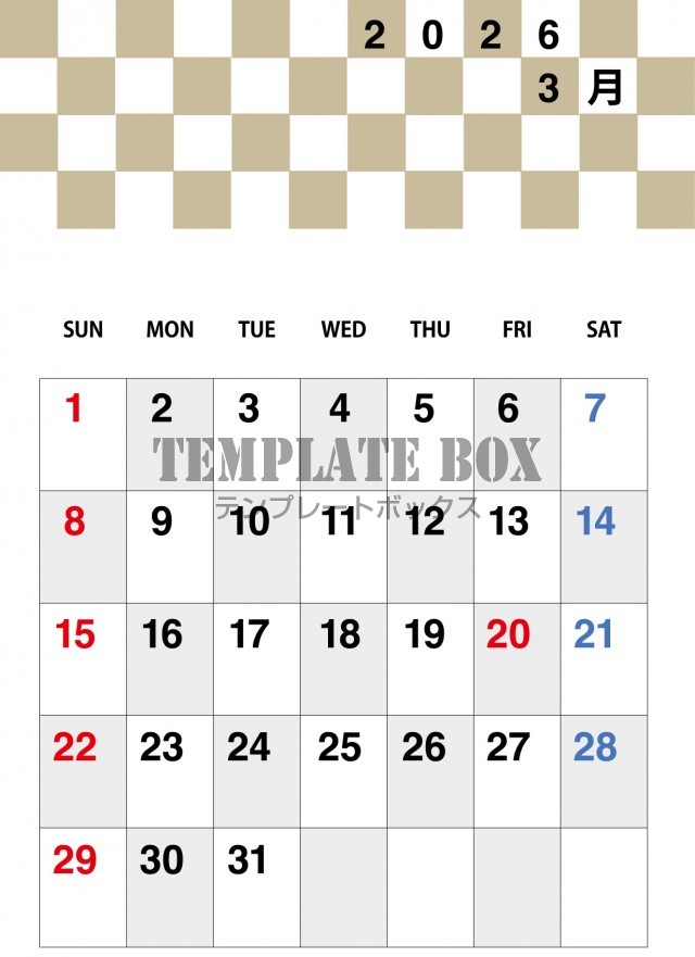 無料テンプレート:2026年3月カレンダー:縦型和モダンカレンダー