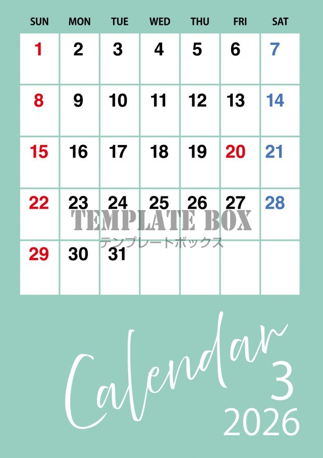 無料テンプレート:2026年3月カレンダー:縦型グリーンのカレンダー