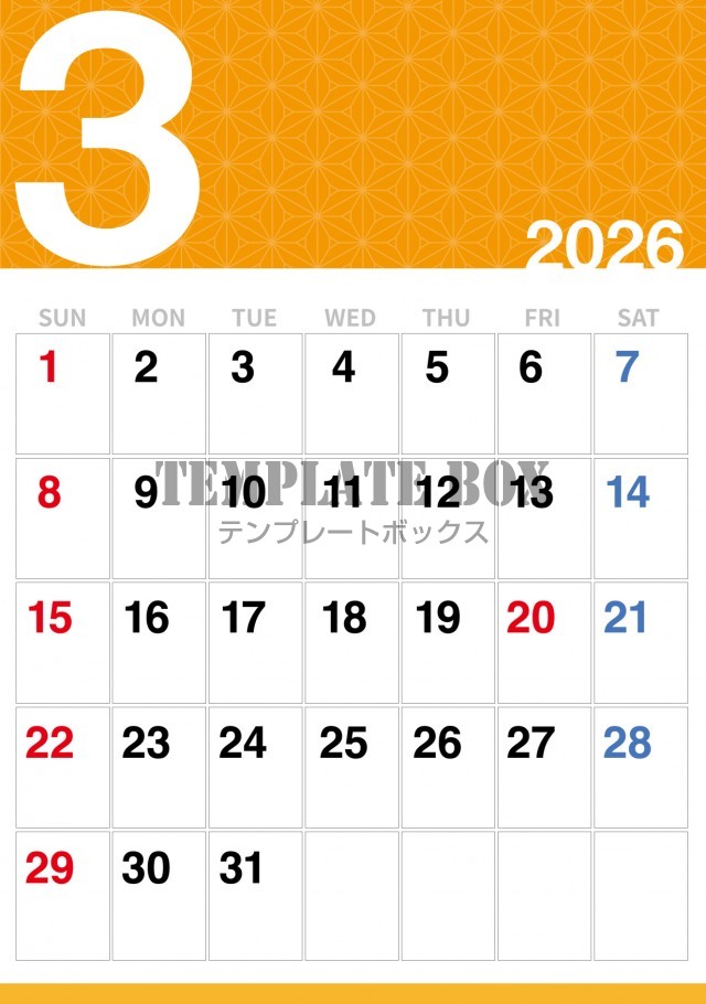 無料テンプレート:2026年3月カレンダー:オレンジ色の和風カレンダー