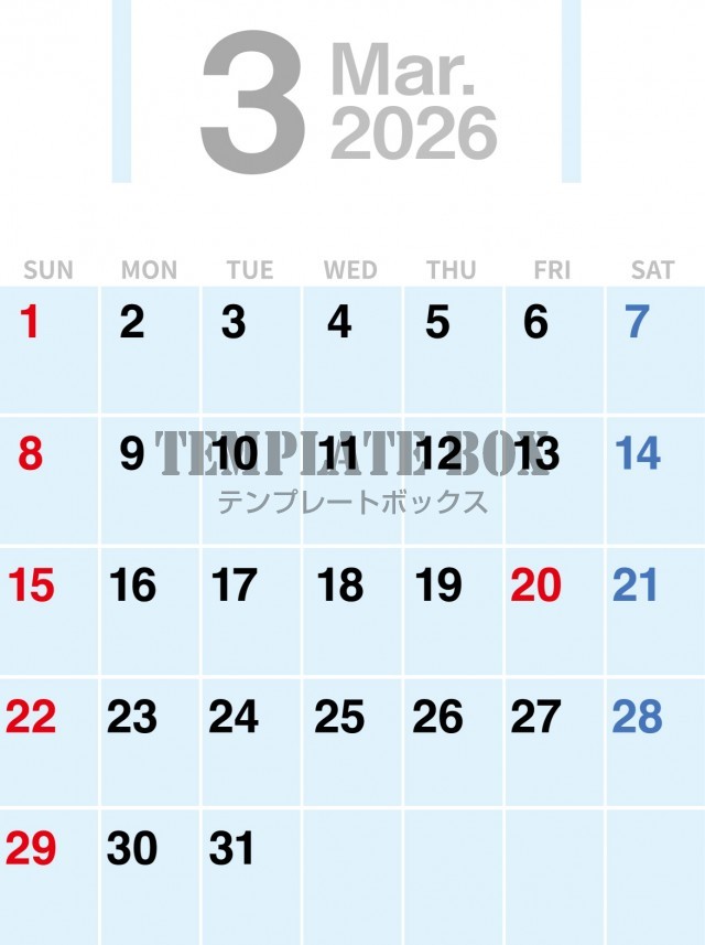 無料テンプレート:2026年3月カレンダー:ブルーが特徴的なカレンダー
