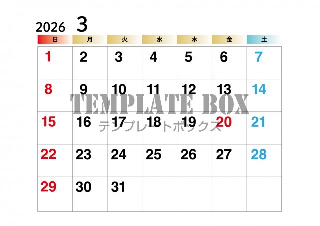 2026年3月カレンダー:枠で仕切られて予定が管理しやすい便利なカレンダー素材