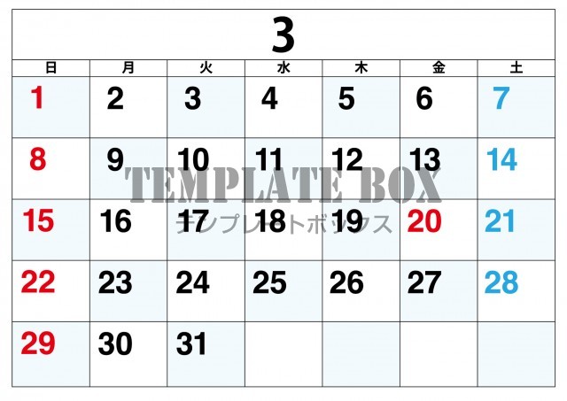 無料テンプレート:2026年3月カレンダー:横型シンプルなカレンダー