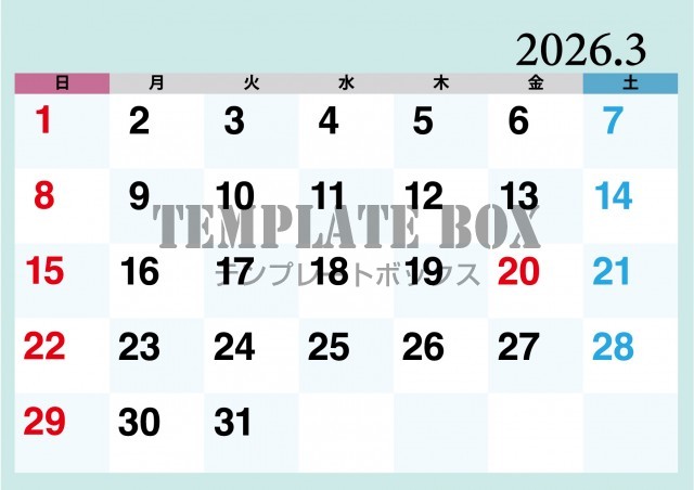 シンプルなデザインで場所を選ばずにおけるカレンダー素材です。2026年3…