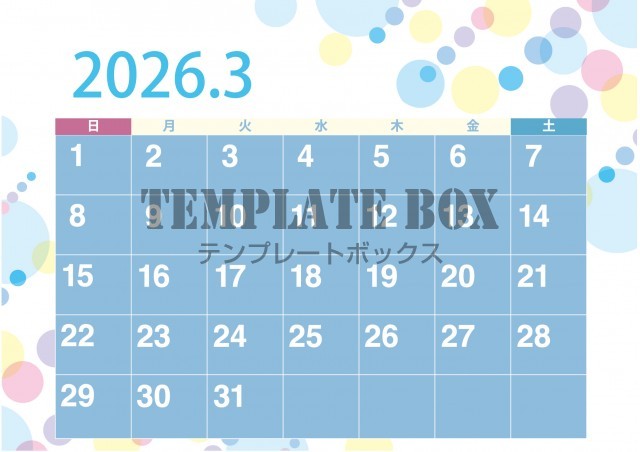 2026年3月カレンダー:横型可愛い配色カレンダー
