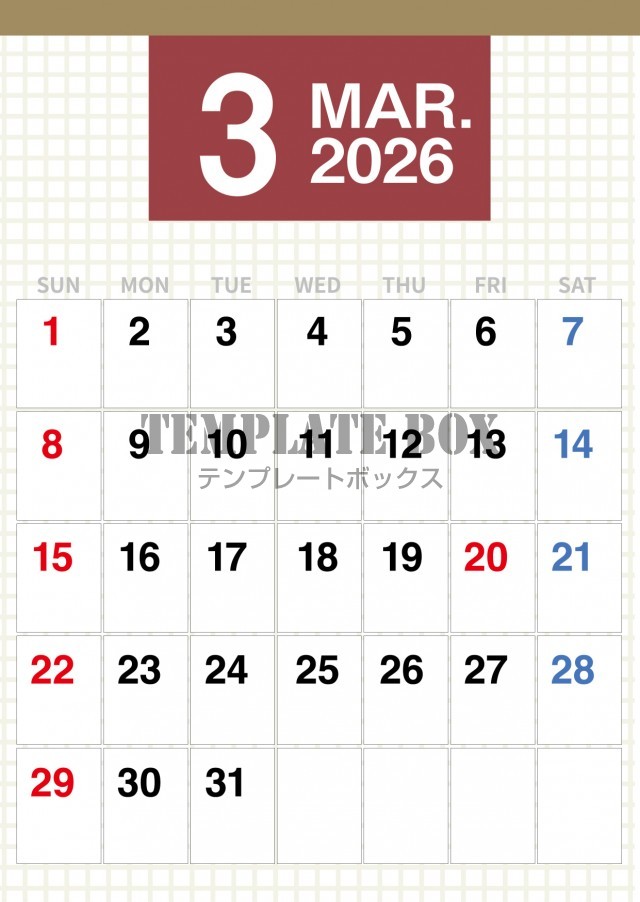 和風のかわいいカレンダーです。2026年3月カレンダーです。枠でわかれた…