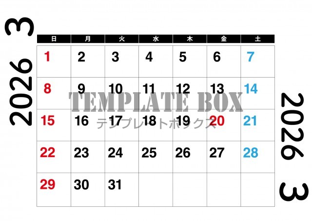 2026年3月カレンダー:枠で仕切られて予定が管理しやすい便利なカレンダー素材