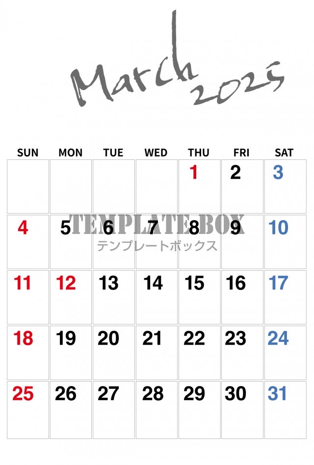 無料テンプレート:2026年3月カレンダー:縦型シンプル筆記体