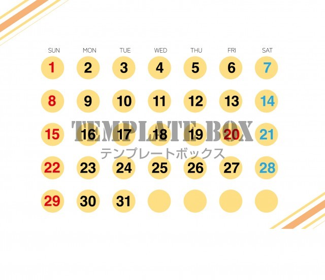 無料テンプレート:2026年3月カレンダー:横型黄色の丸形で囲ったカレンダー