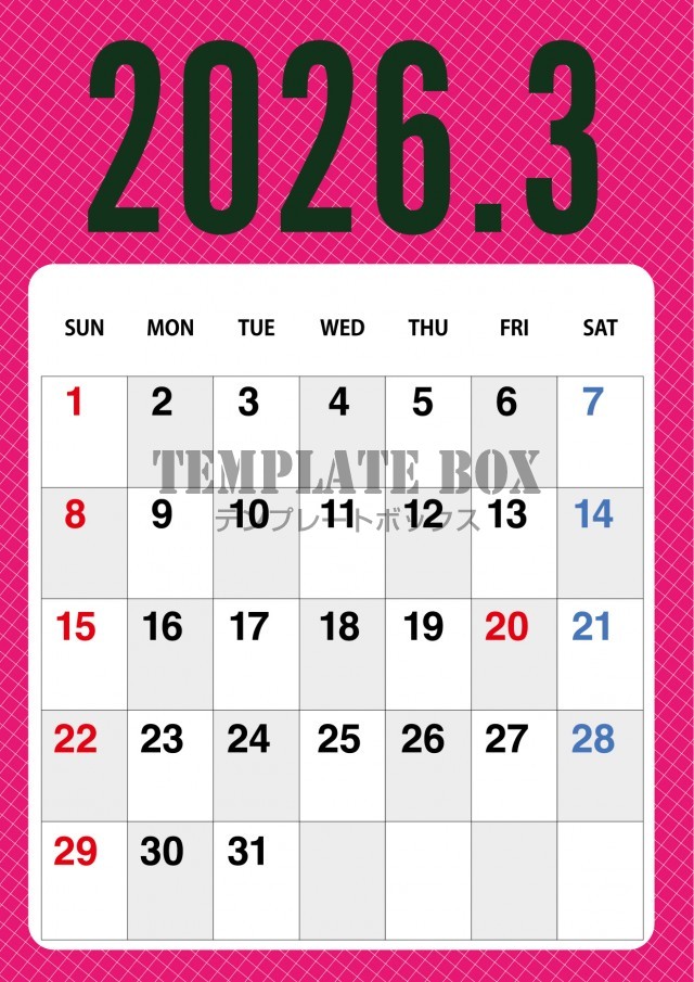 無料テンプレート:2026年3月カレンダー:縦型ピンクがかわいいカレンダー