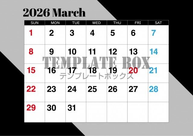 無料テンプレート:2026年3月カレンダー:横型モノクロカレンダー