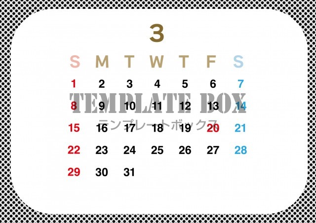 無料テンプレート:2026年3月カレンダー:横型角丸カレンダー
