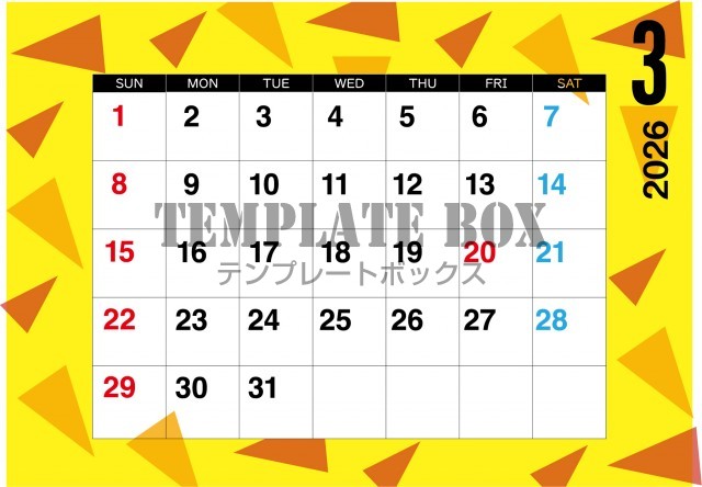 イエローがおしゃれなデザインです。2026年3月カレンダーです。派手なデ…