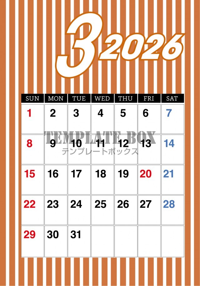 ストライプのラインがかっこいいカレンダーです。2026年3月カレンダーで…