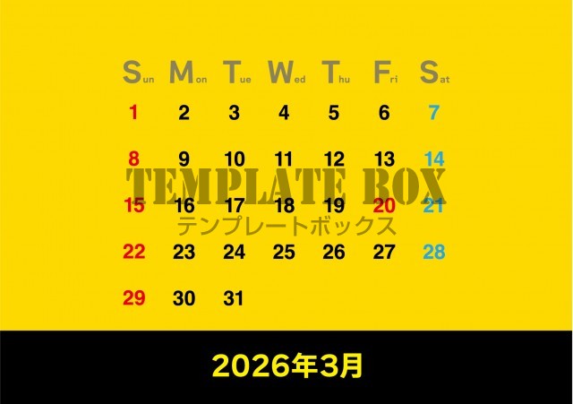 無料テンプレート:2026年3月カレンダー:横型目立つ配色カレンダー