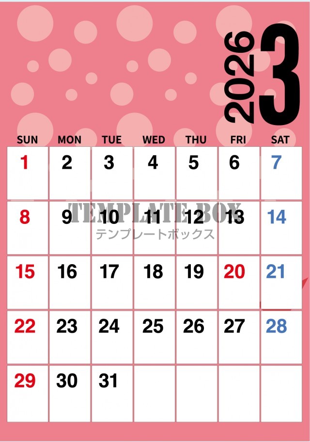 無料テンプレート:2026年3月カレンダー:縦型ドット柄カレンダー