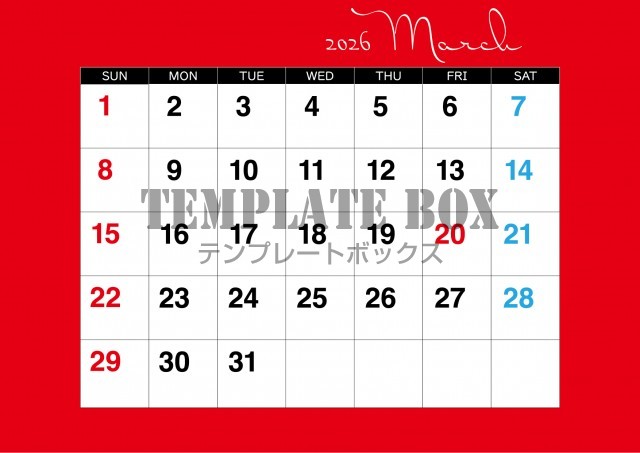無料テンプレート:2026年3月カレンダー:横型赤のおしゃれなカレンダー