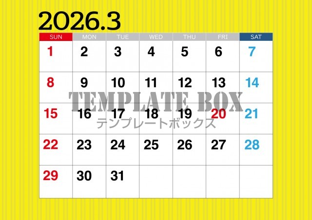 無料テンプレート:2026年3月カレンダー:横型黄色のストライプ柄カレンダー