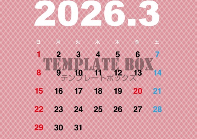 2026年3月カレンダー:縦型ピンクのカレンダー