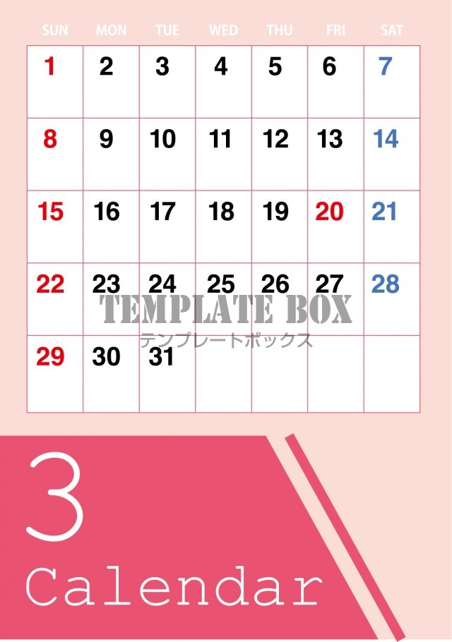 無料テンプレート:2026年3月カレンダー:縦型ピンクのカレンダー
