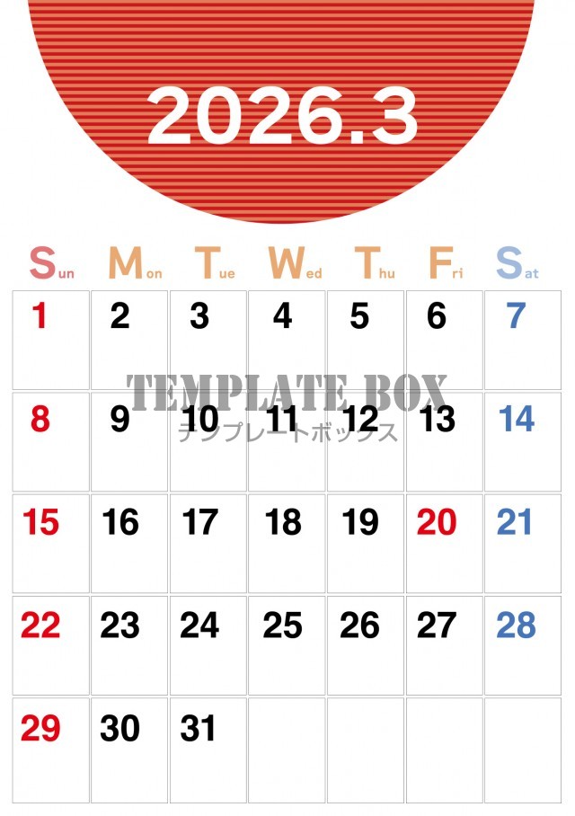 無料テンプレート:2026年3月カレンダー:縦型赤のおしゃれなカレンダー