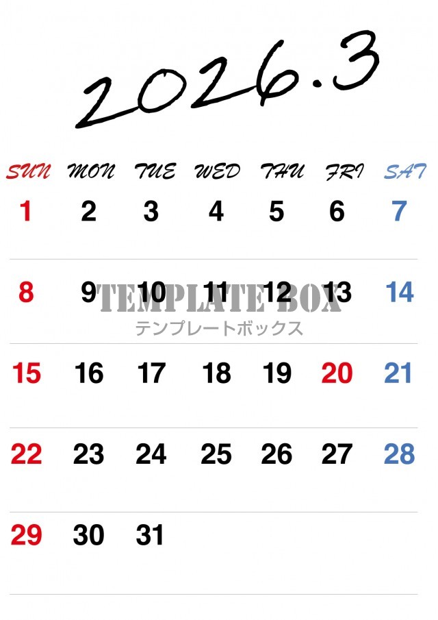 無料テンプレート:2026年3月カレンダー:シンプル便利なカレンダー