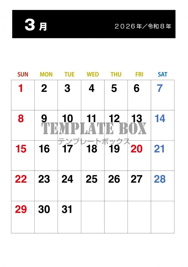 無料テンプレート:2026年3月カレンダー:縦型枠付きカレンダー