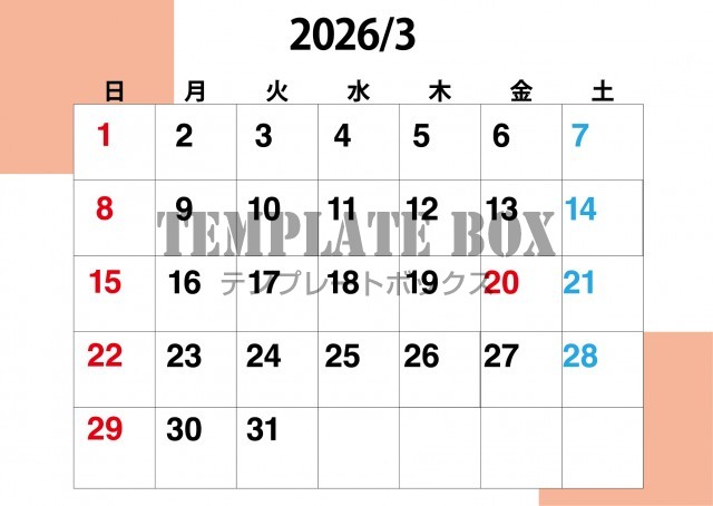 赤いラインが特徴的な2026年3月カレンダーです。シンプルな素材ですので…