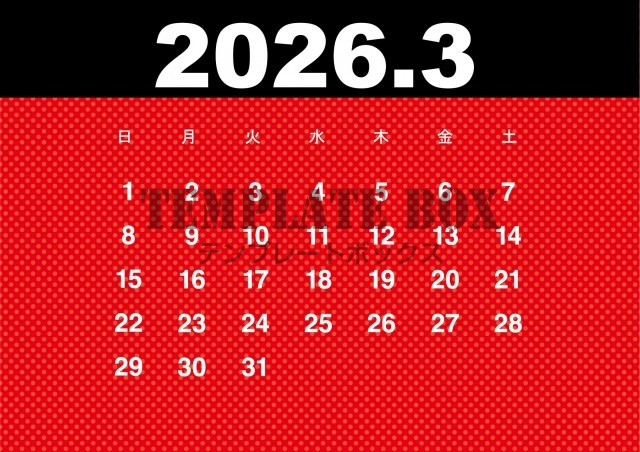 無料テンプレート:2026年3月カレンダー:横型赤と黒のカレンダー