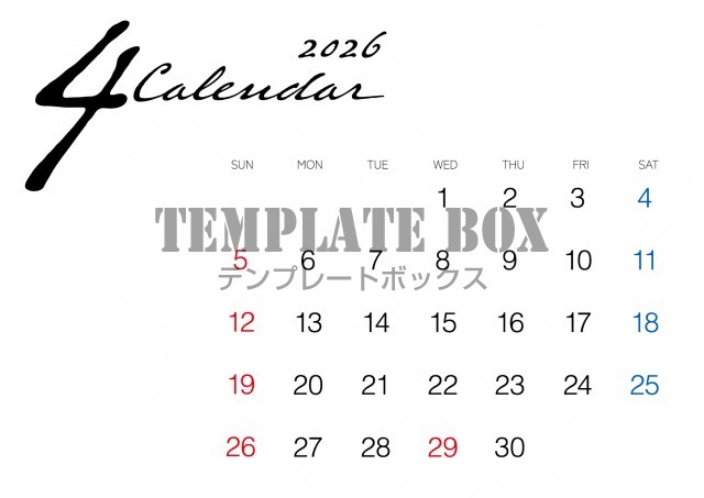 無料テンプレート:2026年4月カレンダー:横型かっこいいカレンダー