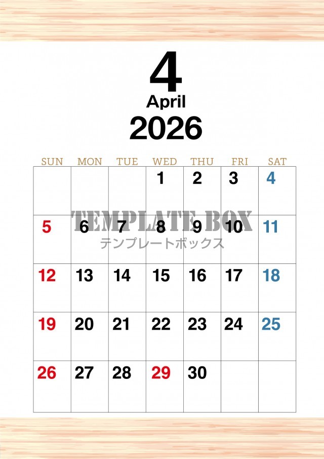 無料テンプレート:2026年4月カレンダー:縦型木目おしゃれカレンダー