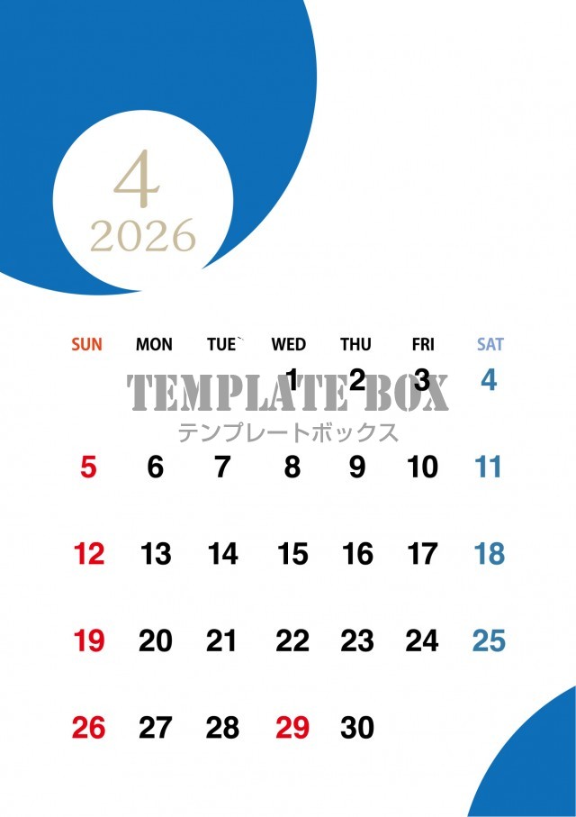 無料テンプレート:2026年4月カレンダー:縦型ブルーのおしゃれなカレンダー