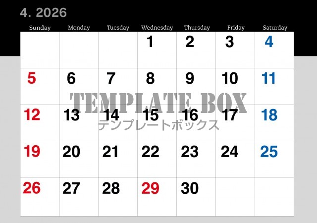 無料テンプレート:2026年4月カレンダー:ツートンカラーカレンダー