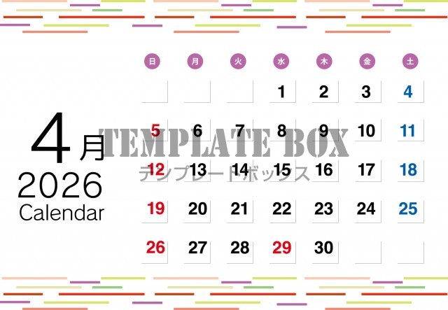 無料テンプレート:2026年4月カレンダー:横型モダンカラーカレンダー