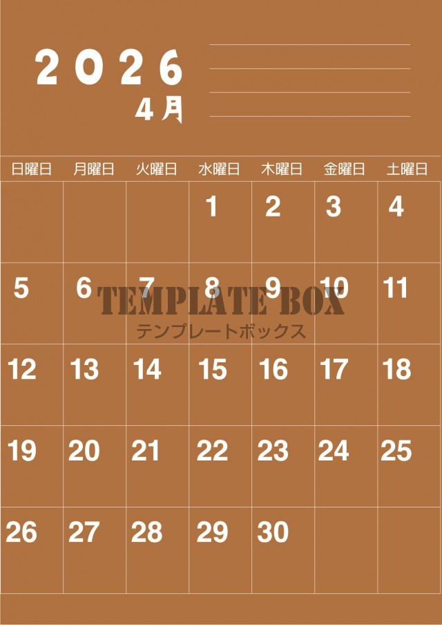 無料テンプレート:2026年4月カレンダー:縦型ブラウンカラーカレンダー