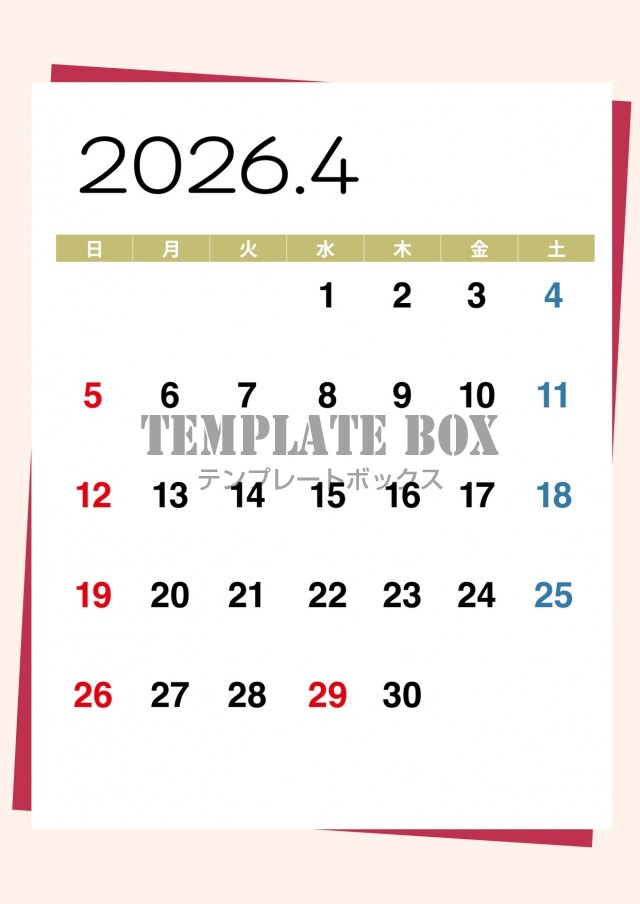 2026年4月カレンダーです。枠でわかれた日付はスケジュール管理に最適で…