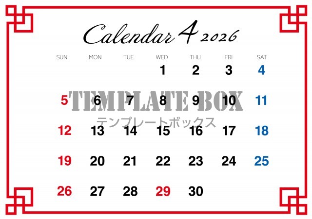 赤がかっこいいおしゃれなカレンダーです。2026年4月カレンダーです。背…