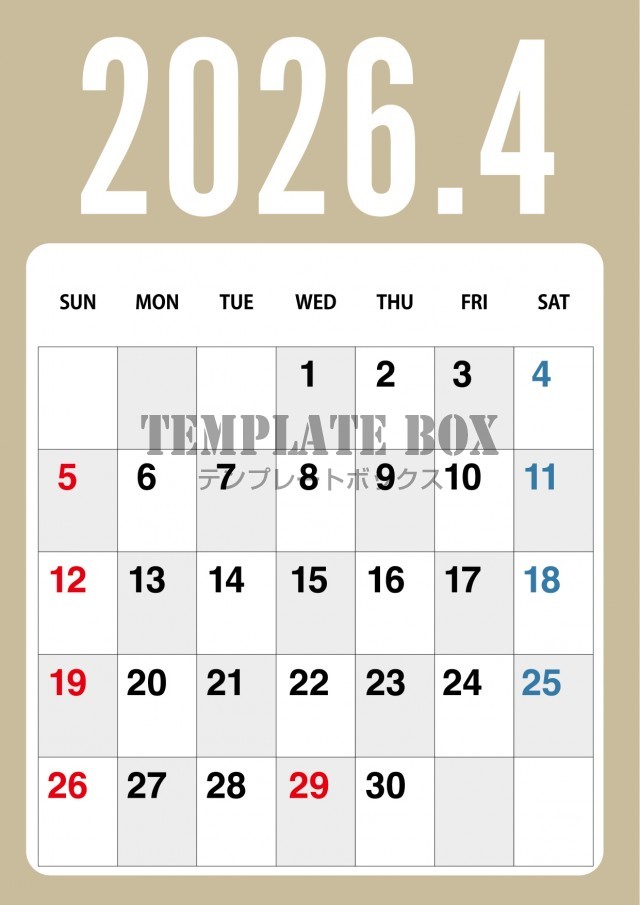 2026年4月カレンダー:ブラウンカラーのカレンダー