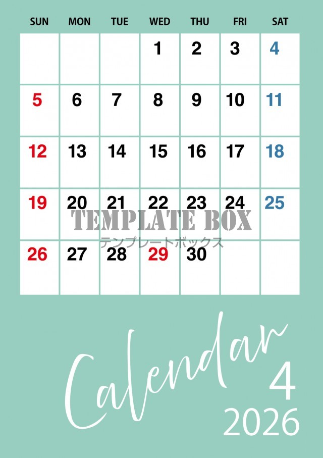 無料テンプレート:2026年4月カレンダー:縦型グリーンのカレンダー