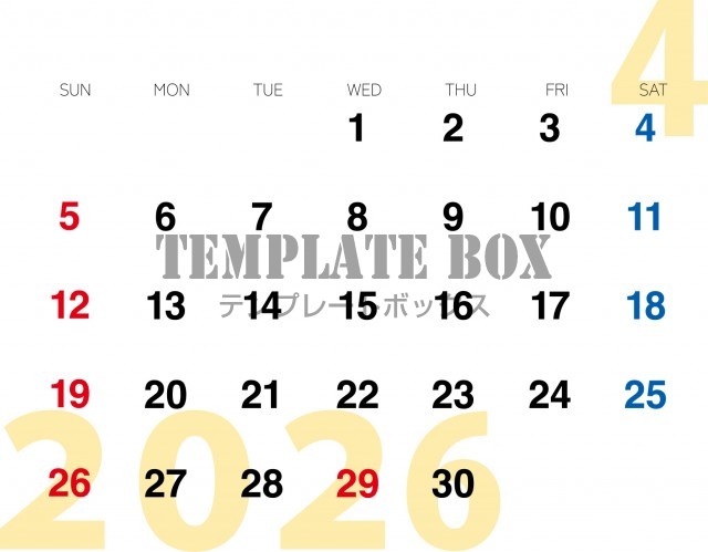 背景が白で文字を書き入れるとみやすいですよ。2026年4月カレンダーです…