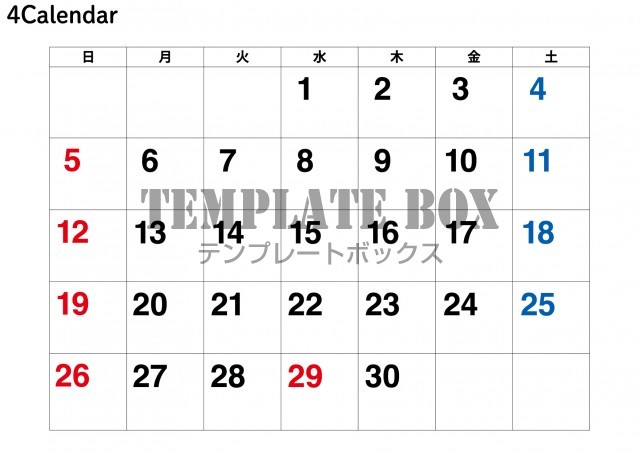 無料テンプレート:2026年4月カレンダー:横型シンプルカレンダー